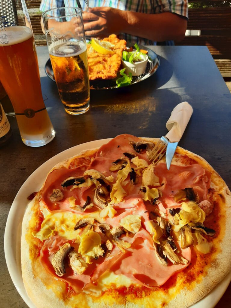 De ham op mijn pizza was uitgedroogd, de champignons hadden meer rimpels dan Rachel Hazes en de kaas leek nog het meeste op rubber, in dikke plakken gesneden. Bert’s ‘pommes’ (Duits voor patatten) waren aardappelpartjes, zonder mayonaise. Ik bedoel aardappels zónder máyo, zoiets bedenk je toch niet?