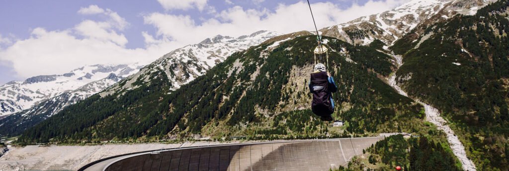 We hebben wel even iets spectaculairs overwogen: 600 meter ‘zweven’ in een harnas aan een stalen draad, langs de damwand van de Schlegeis Stausee, op 131 meter hoogte…